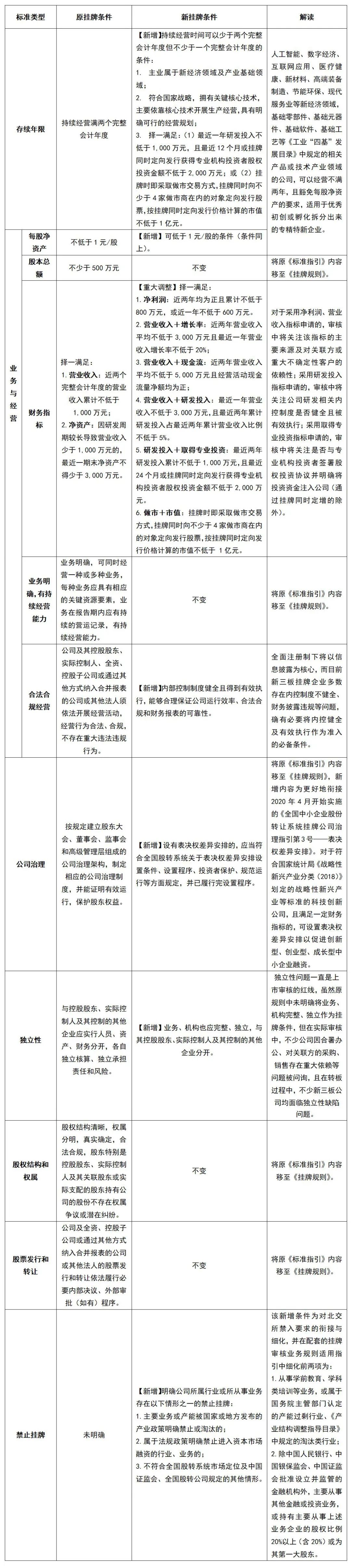 本次修訂,除了將2020年發(fā)布的《全國中小企業(yè)股份轉(zhuǎn)讓系統(tǒng)股票掛牌條件適用基本標準指引》(以下簡稱“《標準指引》”)中的細化標準移至《掛牌規(guī)則》外,相較于原掛牌條件,表面看似提高了新三板的門檻,實質(zhì)上兼顧不同成長階段、經(jīng)營規(guī)模、盈利水平企業(yè)特點及監(jiān)管經(jīng)驗,一改原“一刀切”的財務指標,制定更貼合初創(chuàng)企業(yè)需求的五套多元化財務標準,并在原標準之下為創(chuàng)新型、創(chuàng)業(yè)型、成長型中小企業(yè)準入創(chuàng)造了條件,體現(xiàn)了多元性、包容性、漸進性,與創(chuàng)新層進層條件、北交所上市條件更加契合,有利于向北交所輸送更多高質(zhì)量企業(yè)。具體對比及解讀如下:
