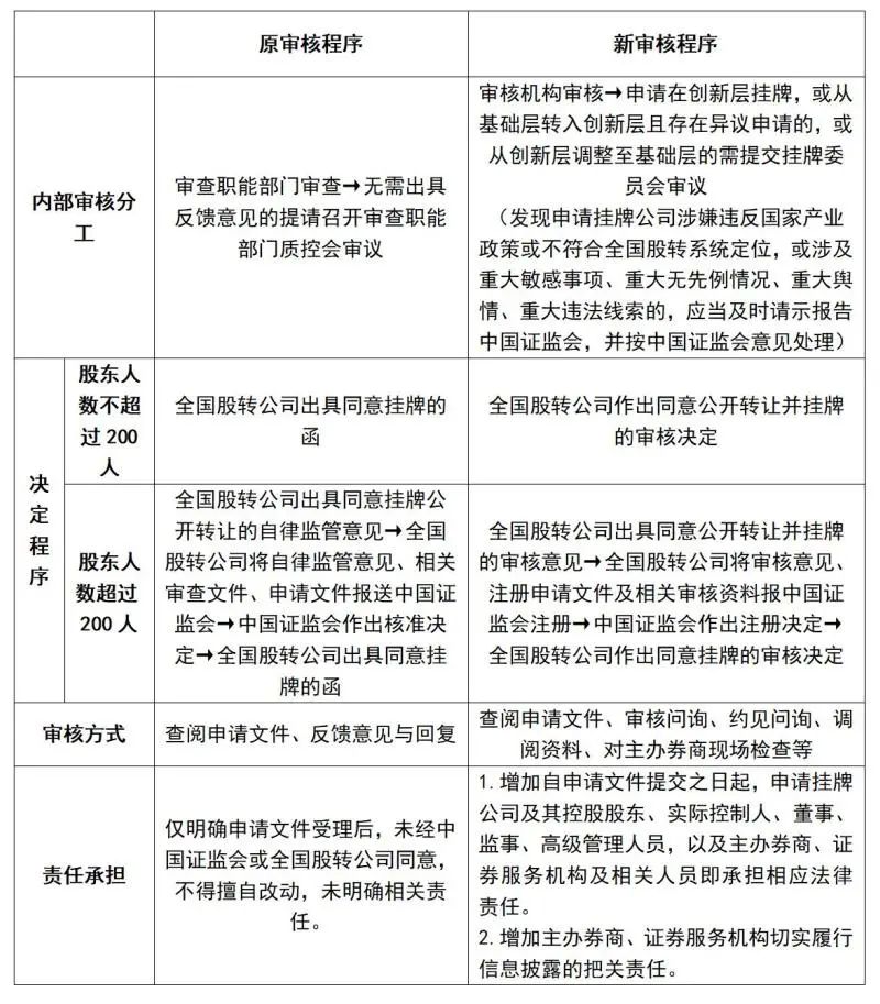 本次修訂實施后,原《全國中小企業(yè)股份轉(zhuǎn)讓系統(tǒng)股票掛牌審查工作指引》相應廢止,相較原審核程序,為規(guī)范內(nèi)部審核制衡,新設(shè)掛牌委員會,并制定配套管理細則規(guī)范掛牌委員會審議質(zhì)量、效率和透明度;完善了全國股轉(zhuǎn)公司與中國證監(jiān)會的注冊銜接安排;豐富了審核方式,不再僅限于書面審核,且明確申報即擔責,以間接督促申請掛牌公司、主辦券商、證券服務機構(gòu)等嚴肅對待信息披露。具體變化情況如下: