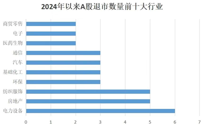 從行業(yè)來看,截至9月13日,2024年以來A股已退市公司多集中在電力設備、房地產(chǎn)、紡織行業(yè)。